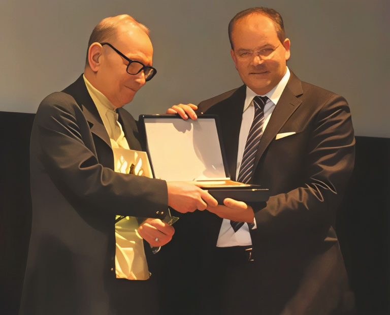 Morricone riceve la Targa d'Oro Sonora dall'orafo Michele Affidato